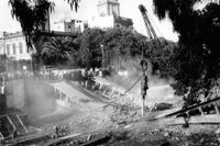 La fotografía en B/N, autoría de Jaime O'Shanahan, ilustra la demolición de uno de los dos puentes históricos que unían Vegueta y Triana, el de piedra, aunque con un poco de imaginación podría ilustrar lo contrario: la demolición de la actual autovía que entierra al Guiniguada. La fotografía en color muestra en la actualidad el mismo tramo, esperemos que "en obras por descubrimiento" dentro de poco.