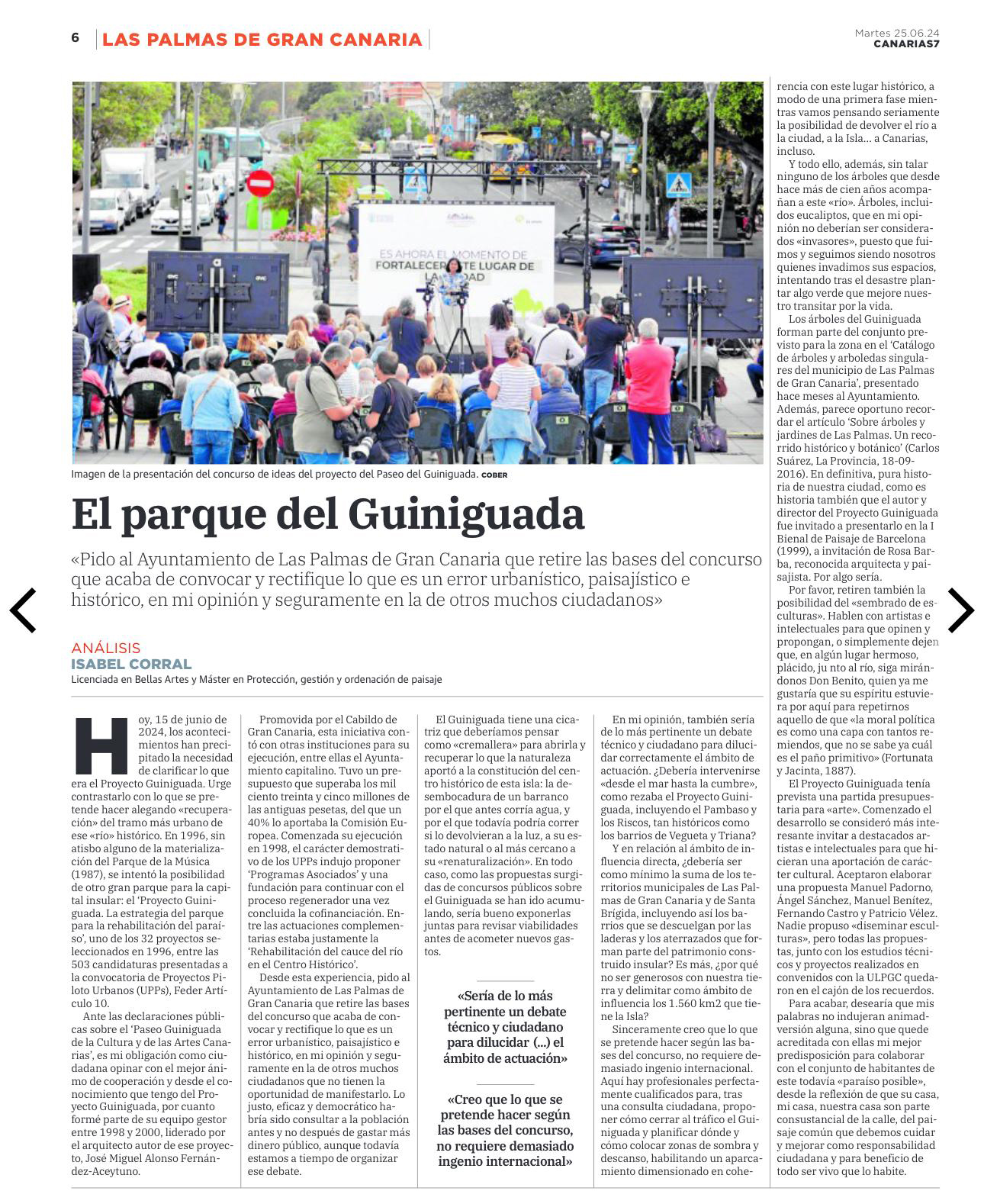 "Las Palmas de Gran Canaria no supera su condición de ciudad poco inteligible ni de ofrecerse a un lenguaje de fácil comprensión. (...) No será más fácil explicar al extranjero que (...) El padre Guiniguada, otrora un bello valle cruzado por puentes que discurre con esplendor a cielo abierto desde el centro de la isla, al atravesar el centro de la ciudad en su búsqueda por aliviarse en el mar, desaparece porque pasa a estar soterrado" (José Francisco Enríquez. Canarias Ahora, 01-07-2024).