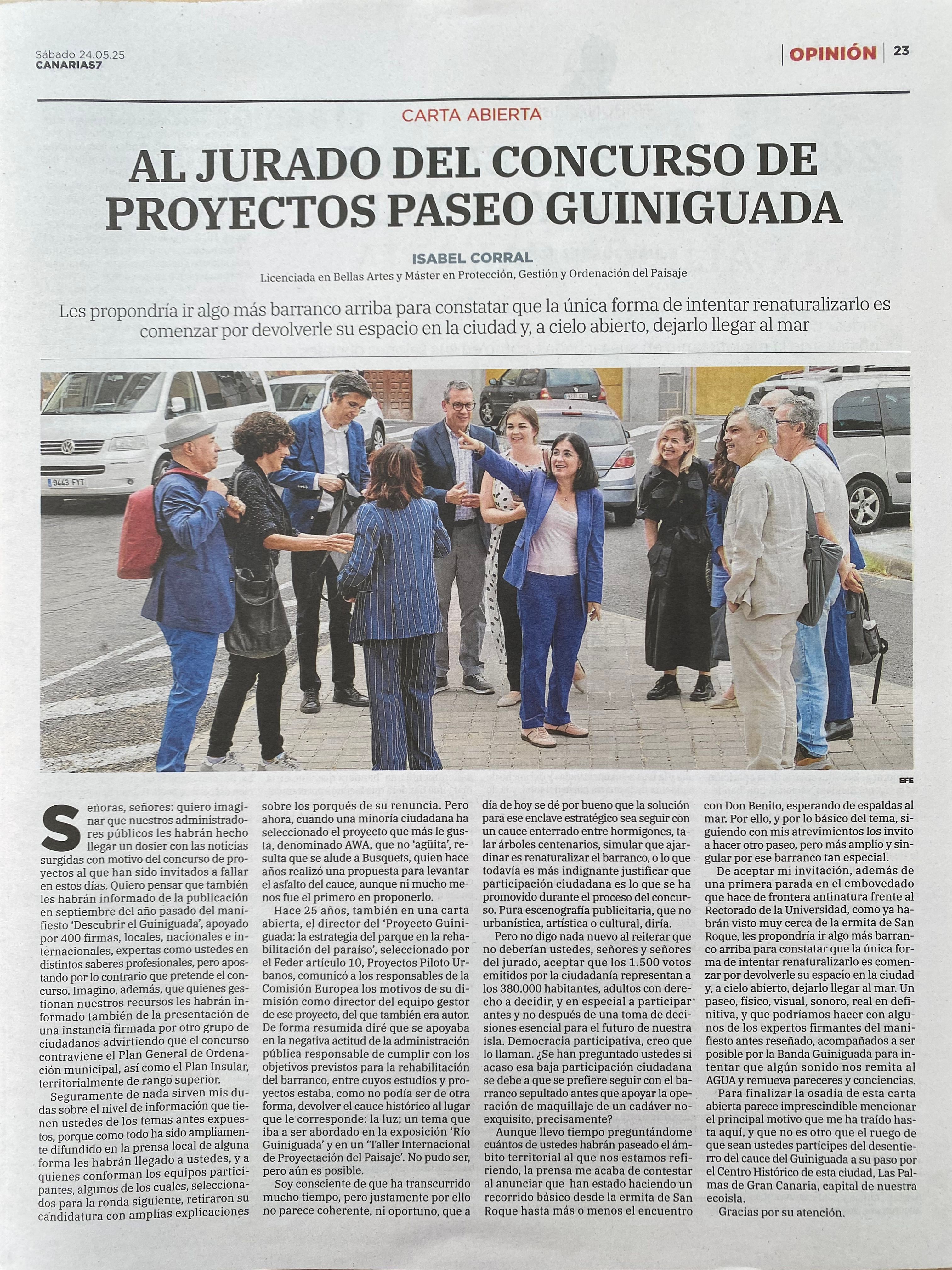 El Jurado ya había ha tenido sus controversias, puesto que Marina Cervera, directora de la Bienal Internacional de Paisaje de Barcelona, decidió no participar, aunque estaba anunciada desde el inicio del concurso. Estudiantes de arquitectura se hicieron eco del desaguisado y "regaron" con algunas críticas gráficas el concurso. Durante todo el mes de mayo la prensa continuó haciéndose eco de lo que iba aconteciendo. También, algunos miembros del Jurado hicieron declaraciones, a la vez que se les escribía una "carta abierta" proponiéndoles "ir algo más barranco arriba para que constataran que la única forma de renaturalizar era, a cielo abierto, dejarlo llegar al mar" (Isabel Corral. Canarias7, 24-05-2025).